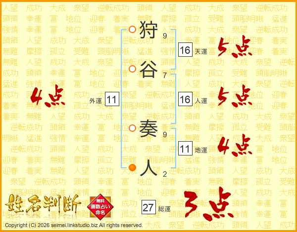 狩(9画)谷(7画) 奏(9画)人(2画)