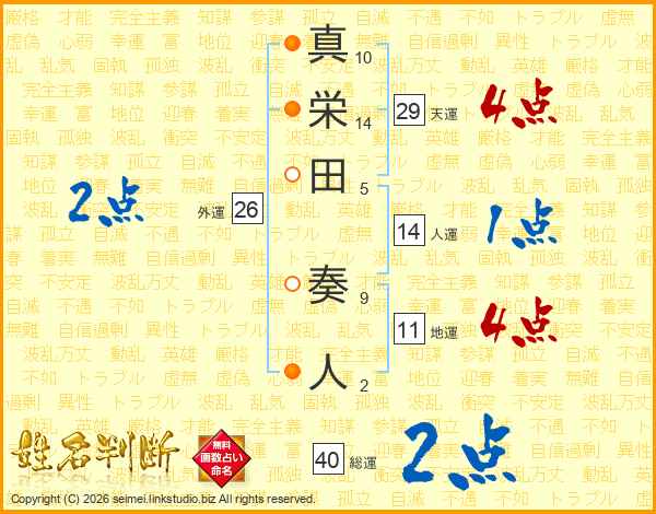 真(10画)栄(14画)田(5画) 奏(9画)人(2画)