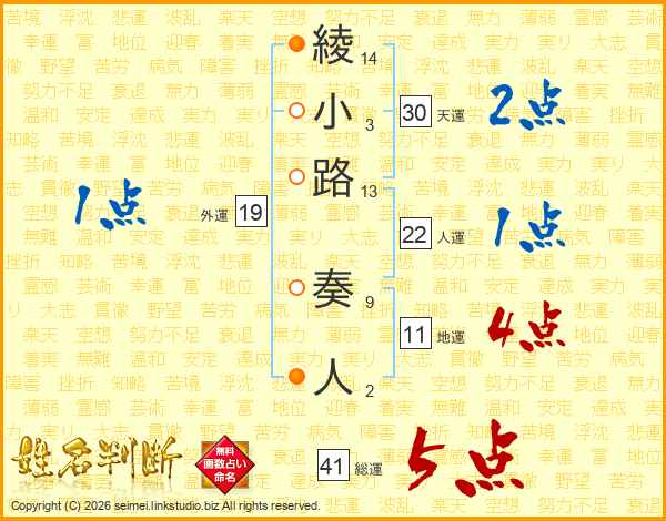 綾(14画)小(3画)路(13画) 奏(9画)人(2画)
