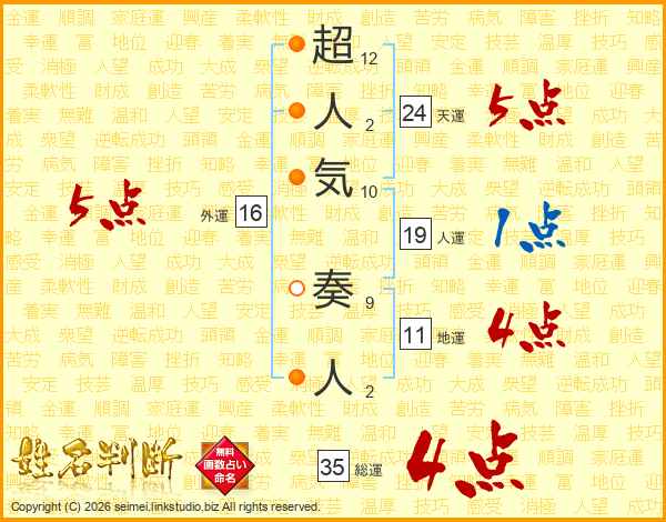 超(12画)人(2画)気(10画) 奏(9画)人(2画)