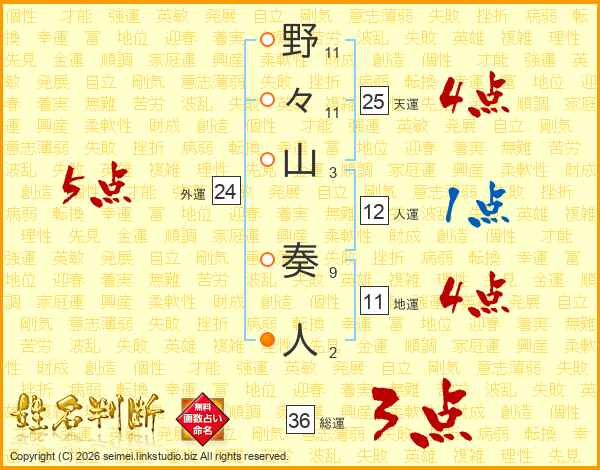 野(11画)々(11画)山(3画) 奏(9画)人(2画)