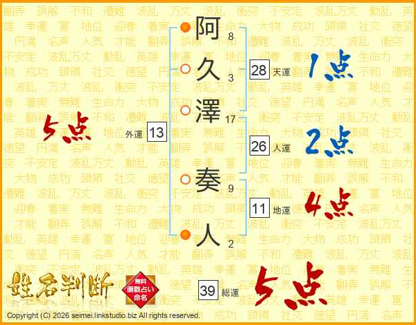 阿久澤奏人さんの総運は39画の5点!