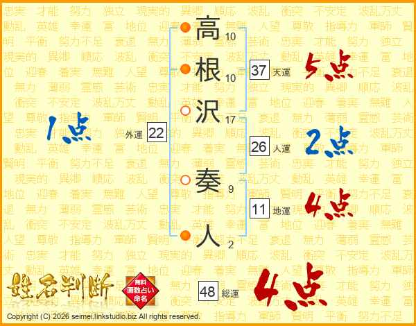 高根沢奏人さんの天運は37画の5点!
