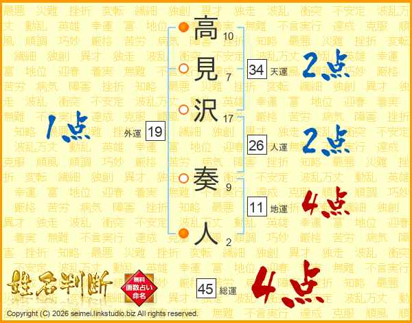 高(10画)見(7画)沢(17画) 奏(9画)人(2画)