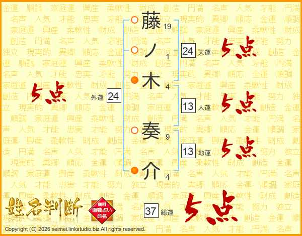 藤(19画)ノ(1画)木(4画) 奏(9画)介(4画)
