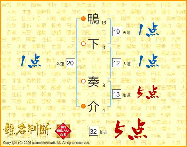 鴨下奏介さんの総運は32画の5点!