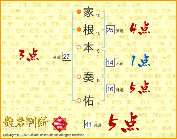 家(10画)根(10画)本(5画) 奏(9画)佑(7画)