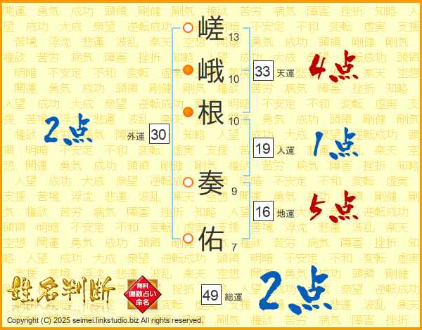 嵯峨根奏佑さんの総運は49画の2点!