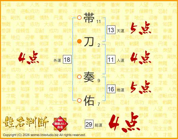 帯刀奏佑さんの総運は29画の4点!