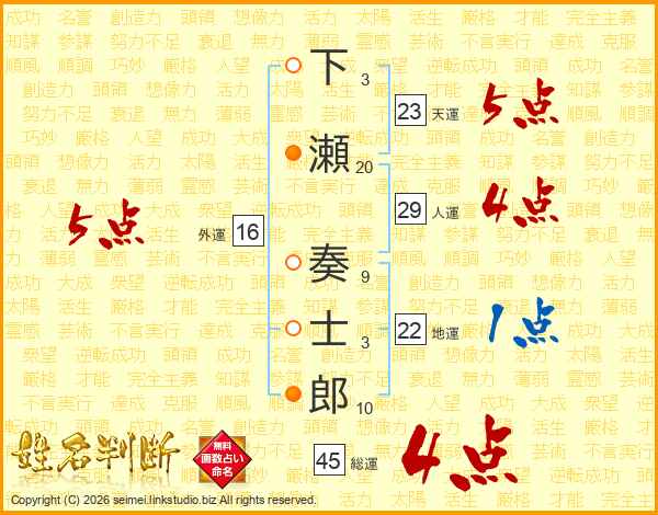 下瀬奏士郎さんの総運は45画の4点!