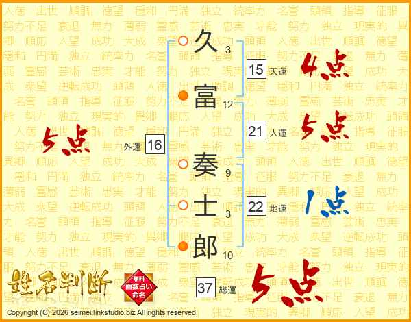 久富奏士郎さんの総運は37画の5点!