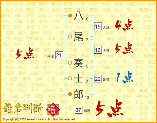 八(8画)尾(7画) 奏(9画)士(3画)郎(10画)