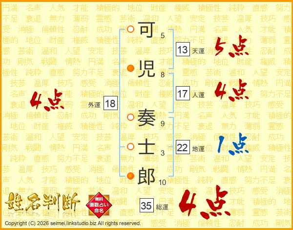 可(5画)児(8画) 奏(9画)士(3画)郎(10画)