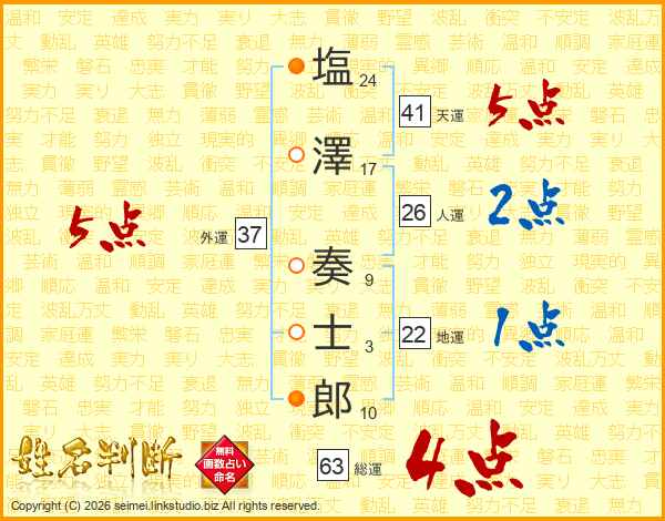 塩(24画)澤(17画) 奏(9画)士(3画)郎(10画)
