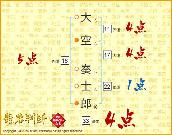 大(3画)空(8画) 奏(9画)士(3画)郎(10画)
