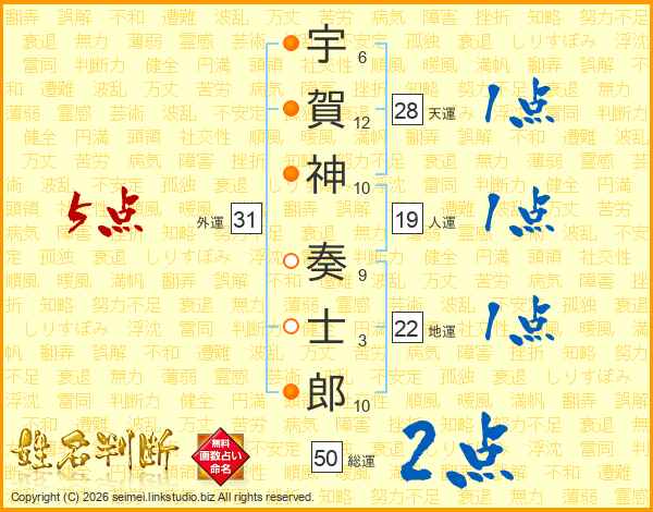 宇賀神奏士郎さんの総運は50画の2点!