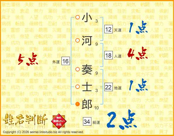 小(3画)河(9画) 奏(9画)士(3画)郎(10画)