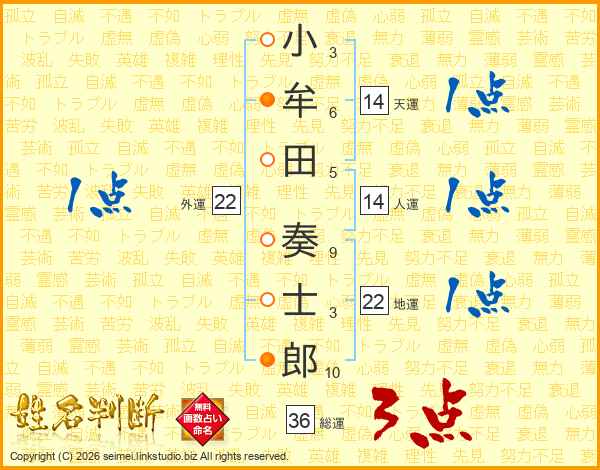 小(3画)牟(6画)田(5画) 奏(9画)士(3画)郎(10画)
