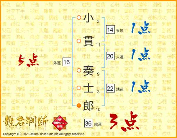 小(3画)貫(11画) 奏(9画)士(3画)郎(10画)