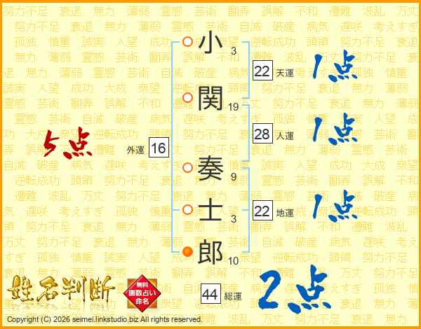 小(3画)関(19画) 奏(9画)士(3画)郎(10画)