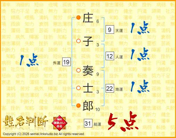 庄(6画)子(3画) 奏(9画)士(3画)郎(10画)