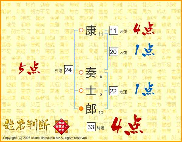 康奏士郎さんの総運は33画の4点!