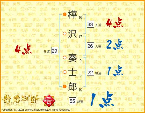 樺(16画)沢(17画) 奏(9画)士(3画)郎(10画)