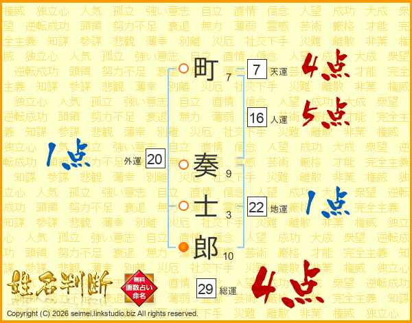 家系が持つ宿命的な運勢を表します。祖先から受け継いだ苗字ですので自分の力が及びません。家柄を象徴します。苗字の合計画数。