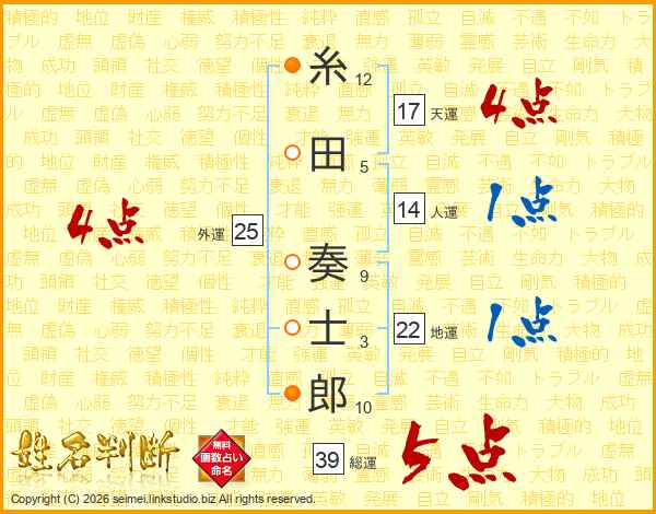 糸田奏士郎さんの総運は39画の5点!
