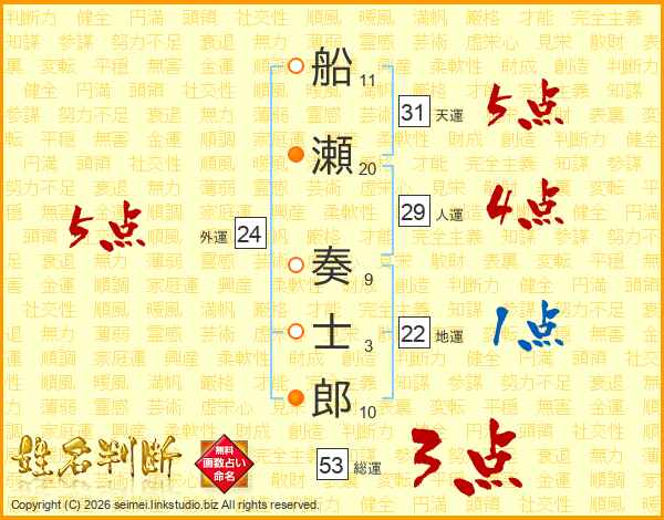 船(11画)瀬(20画) 奏(9画)士(3画)郎(10画)