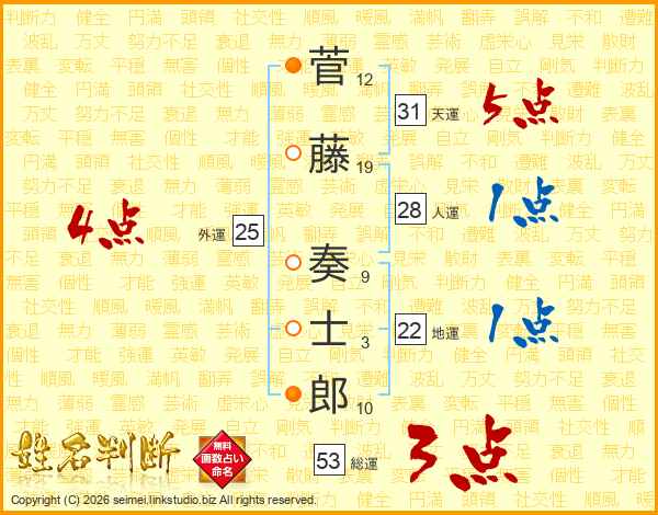 菅(12画)藤(19画) 奏(9画)士(3画)郎(10画)