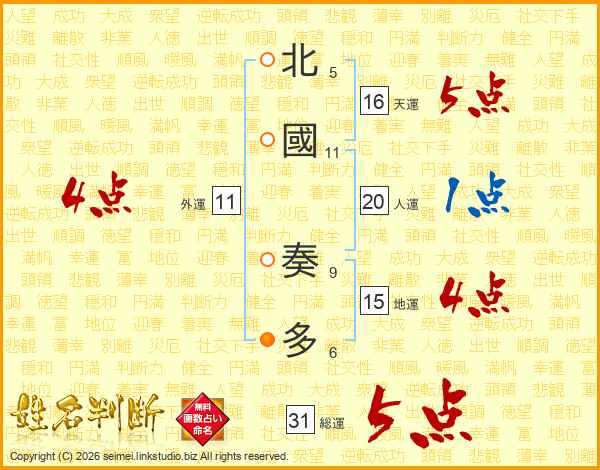 北國奏多さんの天運は16画の5点!