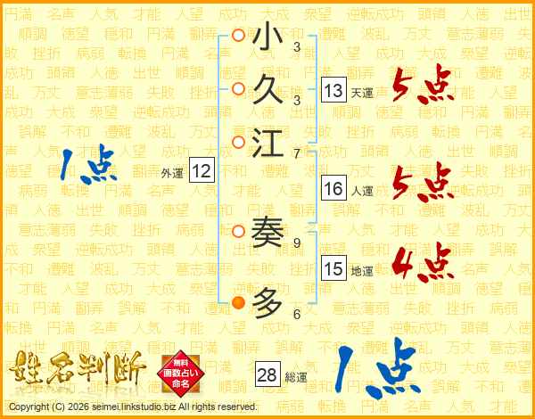 小(3画)久(3画)江(7画) 奏(9画)多(6画)