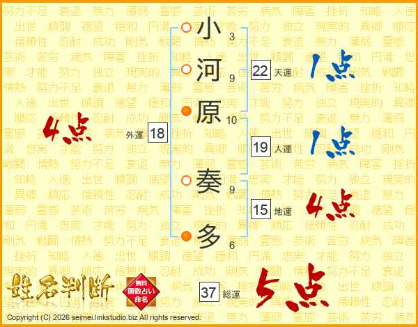 生活面を象徴する運勢です。外部から受ける影響力を表し、結婚運、家庭運や職場、環境への順応性を表します。総運から人運を引いた画数。姓や名が1文字の場合を除く。