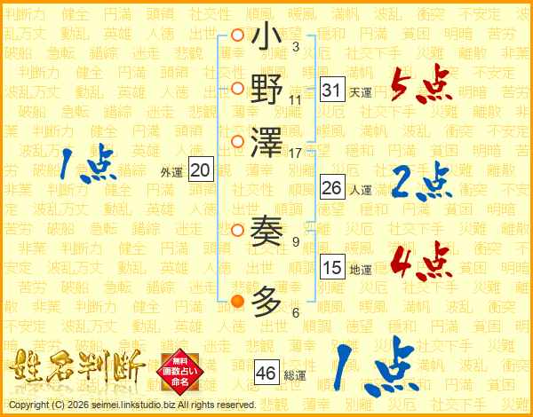 小(3画)野(11画)澤(17画) 奏(9画)多(6画)