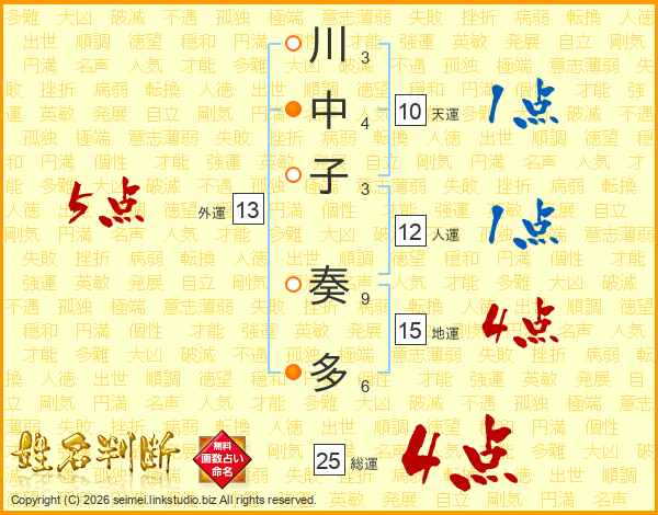 川(3画)中(4画)子(3画) 奏(9画)多(6画)