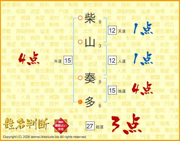 柴(9画)山(3画) 奏(9画)多(6画)