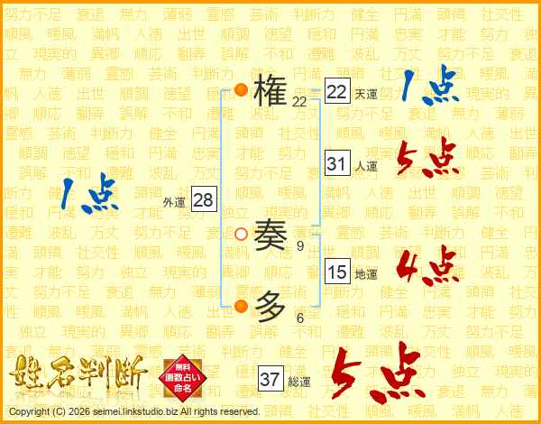 権(22画) 奏(9画)多(6画)