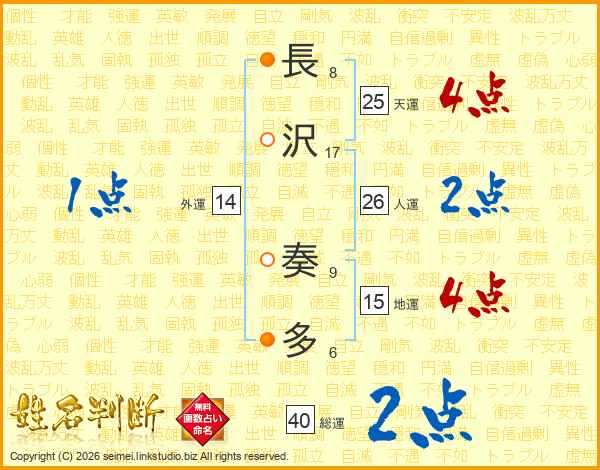 長(8画)沢(17画) 奏(9画)多(6画)