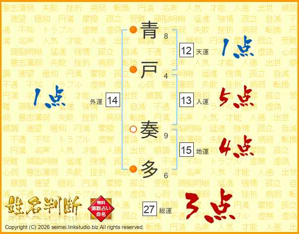 青戸奏多さんの総運は27画の3点!