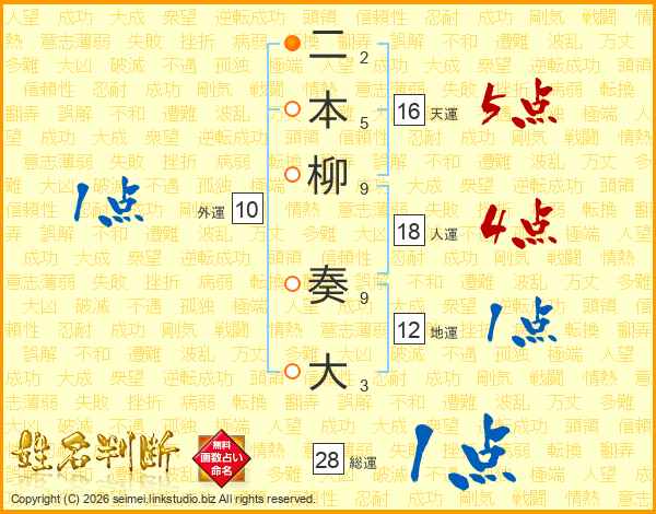 二本柳奏大さんの総運は28画の1点!