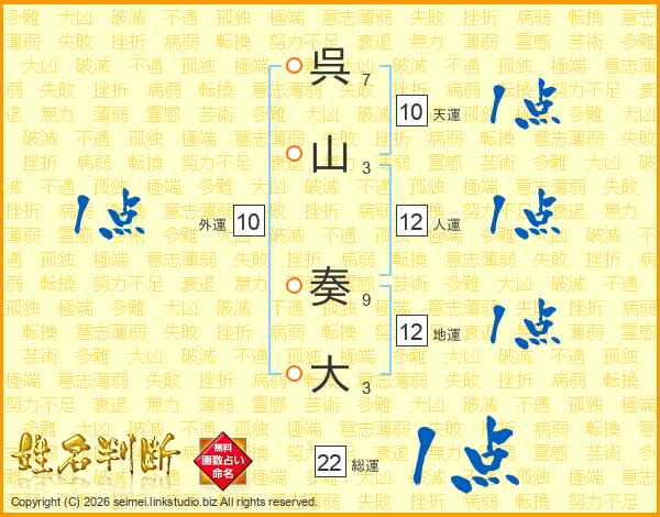 呉山奏大さんの総運は22画の1点!
