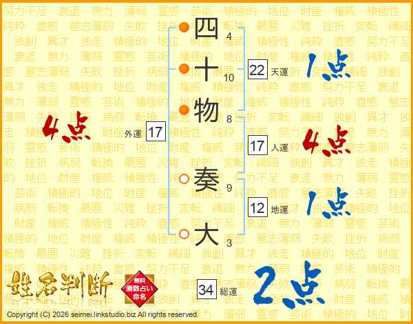 生活面を象徴する運勢です。外部から受ける影響力を表し、結婚運、家庭運や職場、環境への順応性を表します。総運から人運を引いた画数。姓や名が1文字の場合を除く。