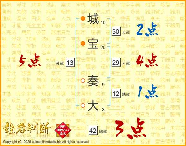 生活面を象徴する運勢です。外部から受ける影響力を表し、結婚運、家庭運や職場、環境への順応性を表します。総運から人運を引いた画数。姓や名が1文字の場合を除く。