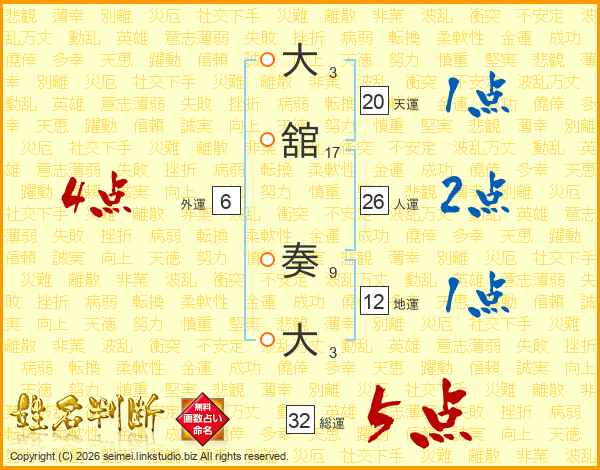 大舘奏大さんの総運は32画の5点!