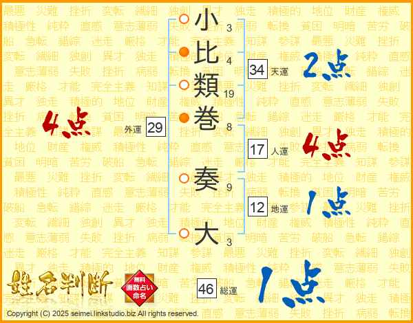 生活面を象徴する運勢です。外部から受ける影響力を表し、結婚運、家庭運や職場、環境への順応性を表します。総運から人運を引いた画数。姓や名が1文字の場合を除く。