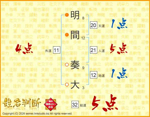 生活面を象徴する運勢です。外部から受ける影響力を表し、結婚運、家庭運や職場、環境への順応性を表します。総運から人運を引いた画数。姓や名が1文字の場合を除く。