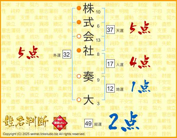 株(10画)式(6画)会(13画)社(8画) 奏(9画)大(3画)