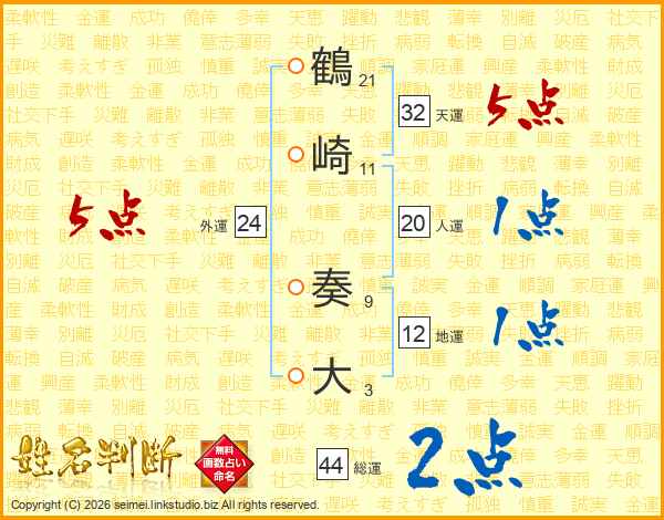 鶴(21画)崎(11画) 奏(9画)大(3画)