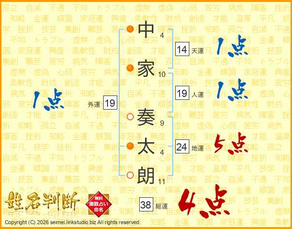 中家奏太朗さんの総運は38画の4点!
